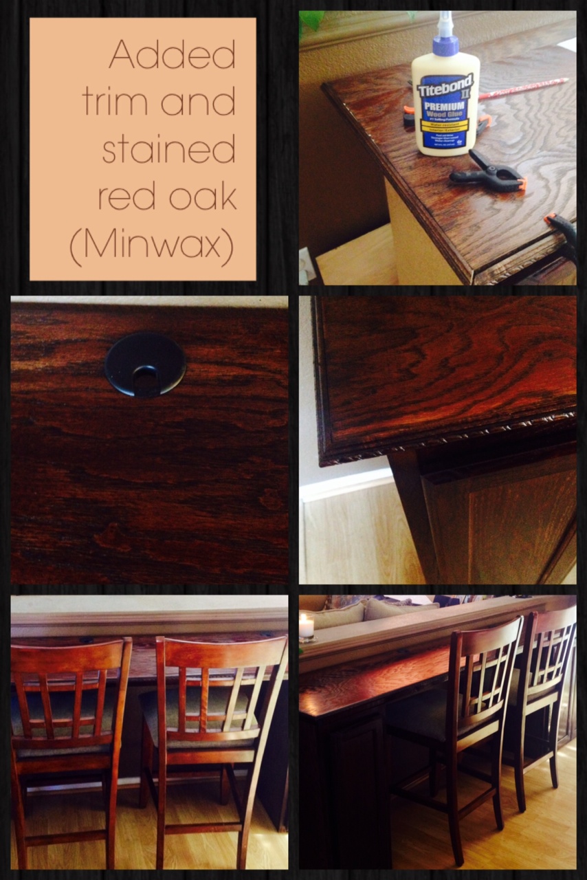 The solution / compromise was to shop at a big warehouse together and despite having a list of what we needed , ended up making it a bigger project than was needed ( and a 3 hour shopping expedition). Arguing over the smoothest option for the top (I wanted laminate flooring as I had seen on Pinterest that only took 10 minutes to install ( I wanted it now, remember), and he wanted real wood), so that children could do homework. With Baby #4 in the cart ( eldest son didn’t want to watch her as well as the other 2 boys so she came with us) with an increasing wet diaper and wailing cry of hunger, oak planking was thrown on the flatbed cart. 2 kitchen wall units , stain , hardware and glue, pretty rope edging and various other pieces of wood.