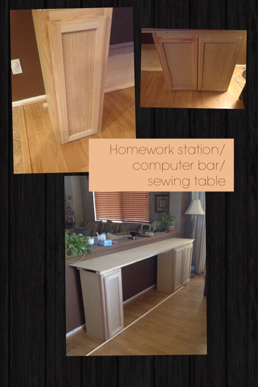 Anyhow, after 2 full days of banging, sanding, drilling , gluing and staining (with a 2 day hiatus whilst he went to work at the fire station in between, he could have called in sick to get this done but no, he’s a good guy and the city needs him – no he is not Batman) the project is complete. Despite my OCD (Obsessive Controlling Disorder) I have to say it was worth the wait. Perfectly done and way better than anything I had previously seen. He even drilled holes and placed grommets in for the power cords, see that is his attention to detail. My sewing machine fits into the right double cabinet and the kids school supplies will go into the smaller  left cabinet.