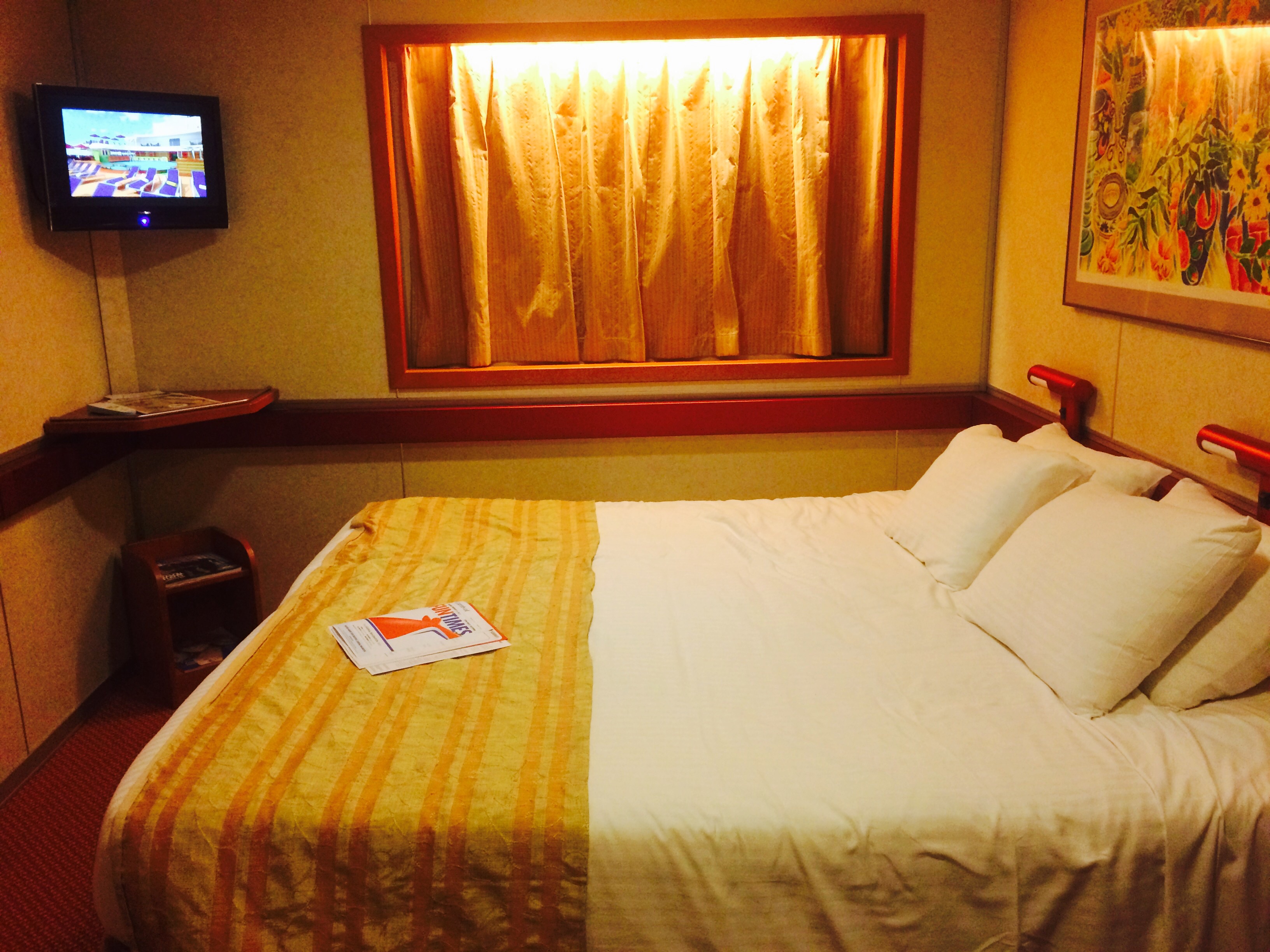 A floating hotel with 2400 guests and even more with staff. We opted for the inside room as it was the cheapest and when you are running away , it doesn’t matter about the view! There was a queen bed and a pretend window with drapes to give the illusion of not being in the cheap seats. That actually helped with my claustrophobia.