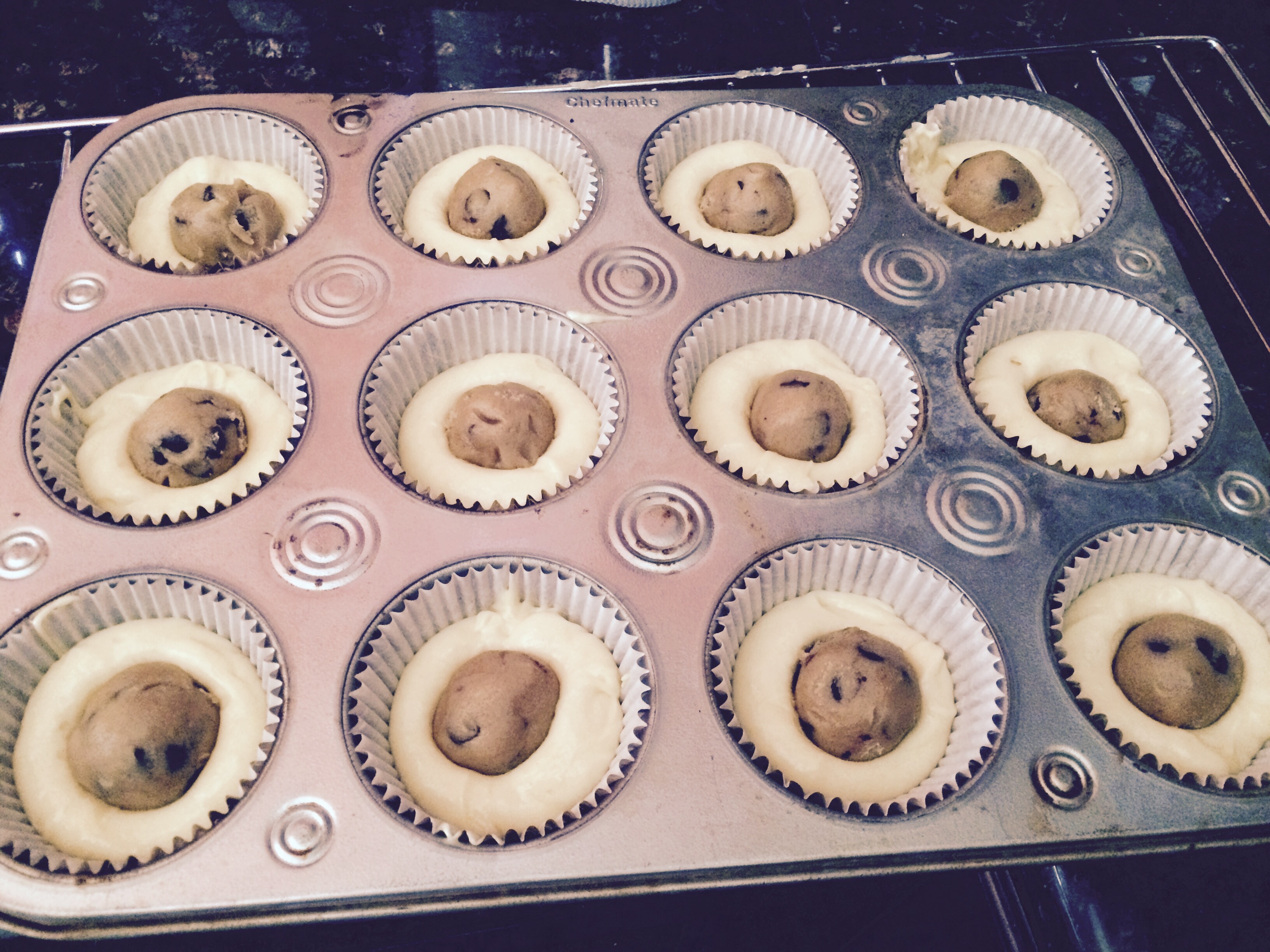I had rolled ready made cookie dough and put them into the freezer in advance. Divided the mix into cupcake liners (24) and dropped a cookie dough ball into each one , pressing down lightly.
