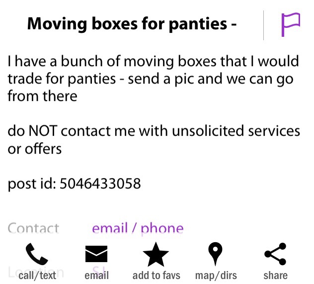Beware of cardboard box weirdo! Standard I am moving house and went onto Craigslist to look for cardboard boxes. I didn’t expect this offer! Share this: Click to share on X (Opens in new window) X Click to share on Facebook (Opens in new window) Facebook Like Loading... Related